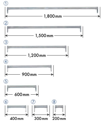 ①SC-18 φ42.7×1,800mm 4.3kg ②SC-15 φ42.7×1,500mm 3.8kg ③SC-12 φ42.7×1,200mm 3.0kg ④SC-09 φ42.7× 900mm 2.4kg ⑤SC-06 φ42.7× 600mm 1.7kg ⑥SC-04 φ42.7× 400mm 1.2kg ⑦SC-03 φ42.7× 300mm 1.0kg ⑧SC-02 φ42.7× 200mm 0.8k
